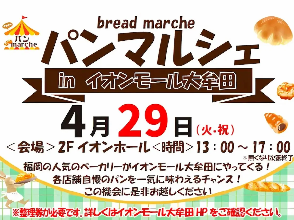 イオンモール大牟田の公式ホームページによると、2025年4月29日(火・祝)に開催される「第9回パンマルシェinイオンモール大牟田」では、パンストックやマツパン、治七のクリームパンやブランジェカイチなどなど、福岡市をはじめとした人気パン屋さんが大集合しますす。